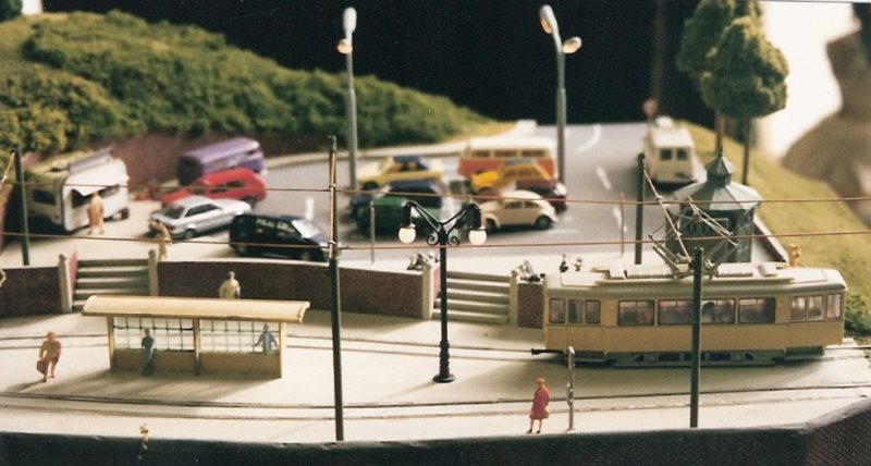 De klassieke bovenleidingmasten van Sommerfeldt met bovenleidingdraad van 0,5 mm. Op de Waelkade zijn deze masten helaas niet groen, maar hebben een, door de gemeente Waelstede voorgeschreven, fantasiekleur vanwege de verlevendiging van de Waelkade....
