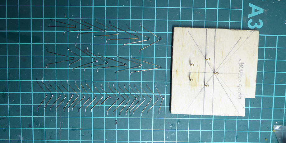 De bevestigingsdraden, die gebruikt waren op Module 2, na de afbraak, met rechts het buigmalletje.
