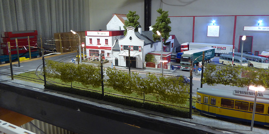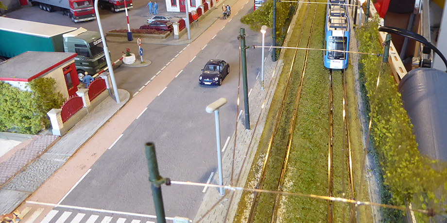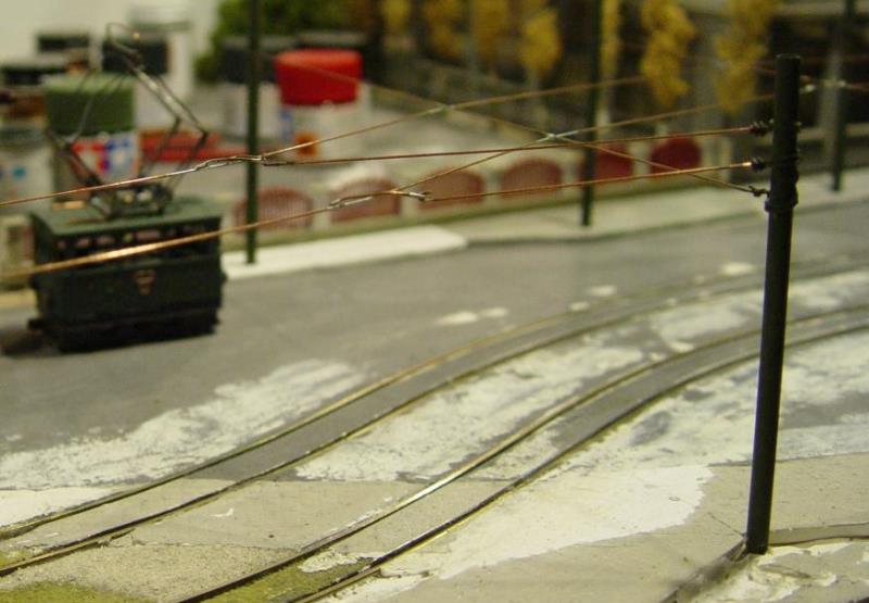 Waar mogelijk wordt in Waelstede bij een enkelsporige tramlijn de klassieke trammast gebruikt. Sommerfeldt levert ze in het zwart, maar ik vind dat ze groen moeten zijn. Dus gaan ze onder de kwast en geweatherd met een vleugje bruin is het sfeertje weer compleet. Als bovenleidingdraad wordt de Sommerfeldtdraad van 0,5 mm dikte gebruikt, die in lengten van 500 mm geleverd wordt. Sommerfeldt levert ook draad van 0,7 mm in lengte van ca 350 mm. Deze werden op de oude clubbaan gebruikt, maar dat zag er niet uit: veel te dik.