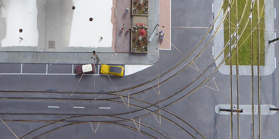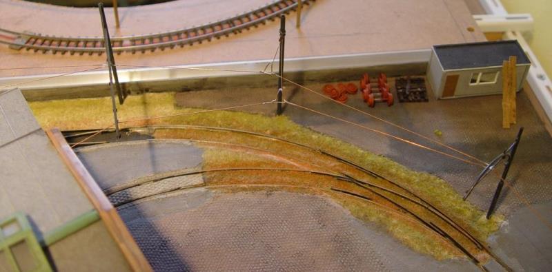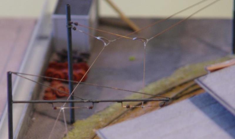 Daarna zijn op de Modules 1, 3 en 4 alleen de rijdraden boven de sporen, waarop daadwerkelijk gereden wordt, vervangen door deze 0,5 mm fosforbronsdraad. Boven de niet bereden sporen op het remiseterrein is de oude bovenleding blijven hangen.