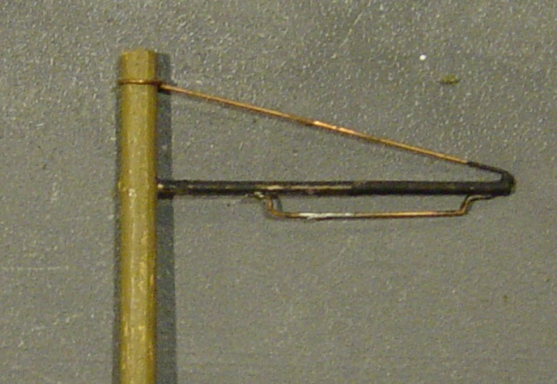 Sommerfeldt adviseert om tussen iedere mast de rijdraad op maat te knippen en aan beide zijden een oogje te buigen. Onnodig extra werk. Met de lange rtijdraden kun je lekker van mast tot mast doorwerken: vastsolderen, met een tangetje direct achter de soldeerverbinding de rijdraad in de goede richting naar de volgende mast buigen, daar vastsolderen, etc. etc. Wanneer de rijdraad aan het eind te kort is om de volgende mast te bereiken, kunnen ze gewoon aan elkaar worden gesoldeerd met behulp van een klein stukje rijdraad er boven op. Ok dit gebeurt bij het grootbedrijf op deze manier. Hieronder een voorbeeld links boven het wachthuisje.