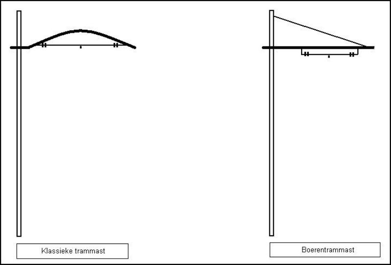 Gemakkelijk te maken is de Boerentrammast; deze wordt in Waelstede zo genoemd, omdat deze bij het buurtspoor in Belgie veel gebruikt werd. Een mast van 3 mm messing, een uithouder van 1 mm en een bovenleidingdraad als schuine verbinding. Ook de draad met isolatoren, waaraan de rijdraad bevestigd wordt, is gemaakt van bovenleidingdraad. In Waelstede wordt dit type met name gebruikt waar vanuit een punt twee sporen overspannen moeten worden. Op het remiseterrein staat er een en langs de Stationsstraat komen er zeker enkele te staan. Een leuke variant is om de mast te maken van een rondhoutje. Het 1 mm pijpje wordt dan in een voorgeboord gaatje in de houten mast gelijmd. Deze masten werden gebruikt voor een piepklein dioramaatje voor de Rivarossi tram.