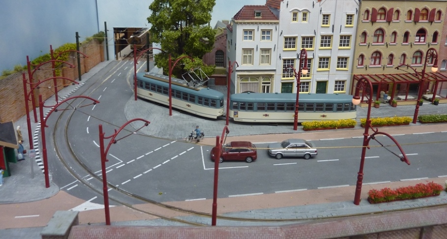 De situatie aan de Van Broekhoflaan, waarbij dezelfde probleemsituatie ontstond, als bij de remise. Let even niet op de slordig geparkeerde tramlok van de WMF.