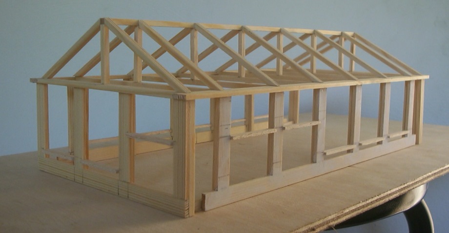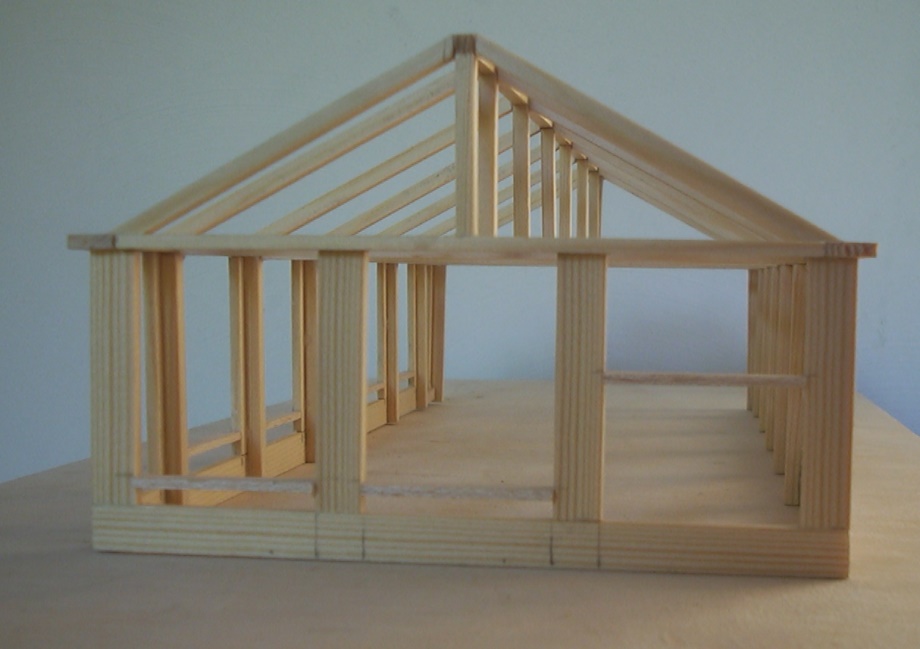 Met behulp van de latjes 4 * 4 mm werden de ‘zolderbalken’ van de open dakconstructie tussen de zijwanden gemaakt. Hierop konden vervolgens weer de dakspanten worden gelijmd,
