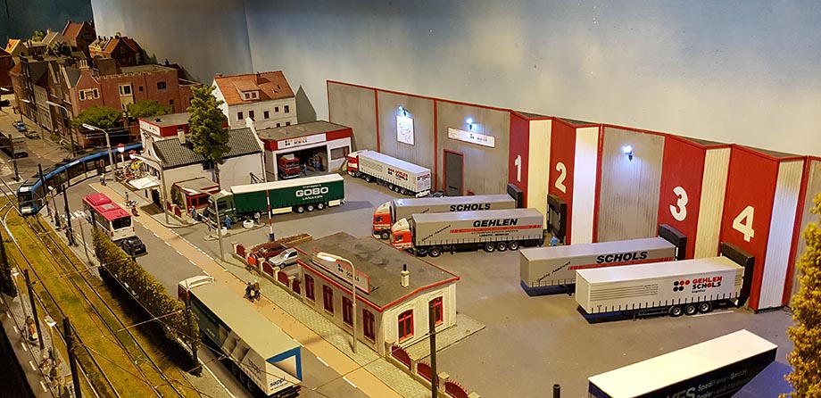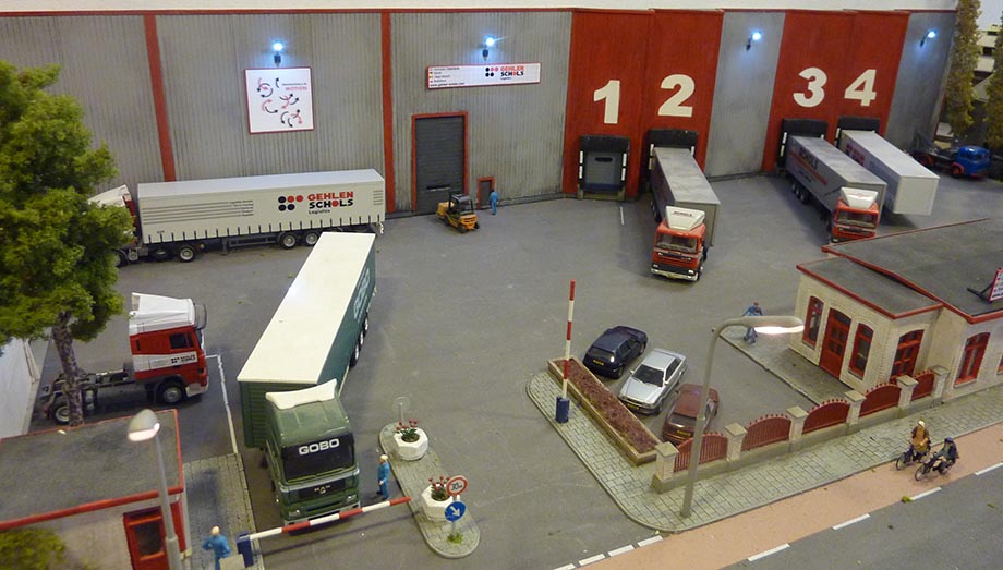 De grote opslagloods van Gehlen Schols Logistics in Waelstede is helemaal opgetrokken van Evergreen plaatmateriaal en strips. De opslagloods met laadpoorten is van het bekende type: een stalen constructie met een bekleding van gegolfde staalplaten. Van de loods is alleen de voorgevel gebouwd en tegen de achterwand van de module geplaatst. De constructie in model is simpel en uit de foto' s af te leiden. De vier laadpoorten zijn in een hoek tegen de wand van de loods geplaatst; een niet ongebruikelijke methode om het docken van de vrachtwagens gemakkelijker te maken, wanneer de beschikbare ruimte aan de krappe kant is. Bovendien komt het totaal hierdoor in model wat dynamischer over. Op de bouw van de laadpoorten wordt hieronder verder ingegaan.