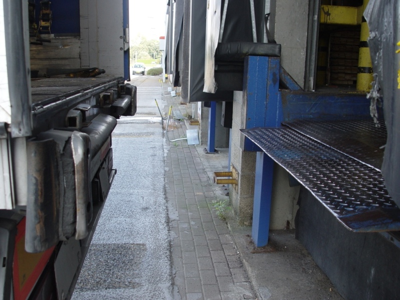 Detail van de laadpoort (rechts). Te zien zijn de blauwe afstandshouders, waar de vrachtwagen met de stootrubbers tegenaan rijdt. In het midden de klep, die in de vrachtwagens komt te liggen en daarachter het hefbordes, dat hier in de laagste stand staat. Deze kan helemaal omhoog totaan de bovenzijde van de blauwe afstandsbalk.