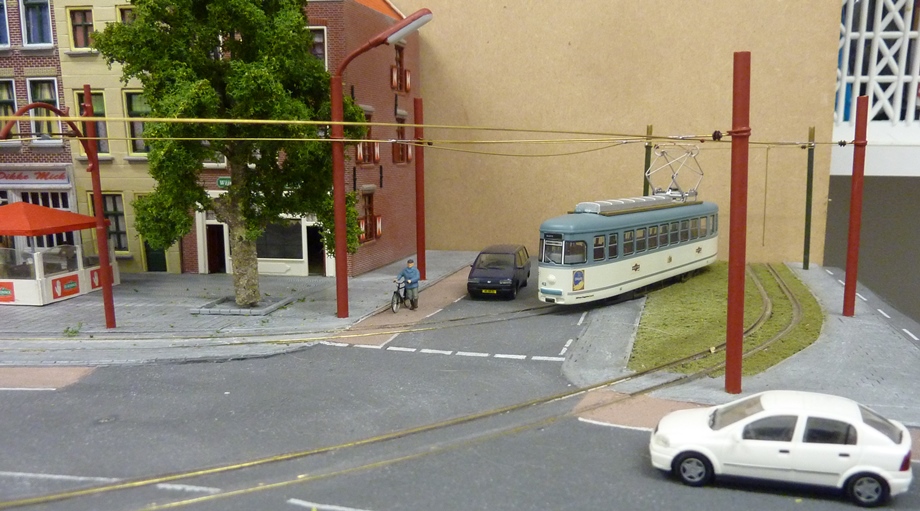 Tot slot nog een overzicht van de situatie aan deze zijde van de module. De trammast bij de kop van de GTN 42 is 5 mm verplaatst, omdat sommige tramwagens de mast net aantikten.