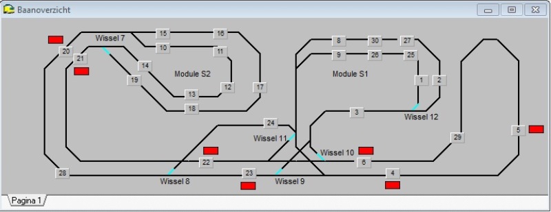 Het baanontwerp in Koploper met alle blokken ingetekend. De blokken met een rood vlak ernaast zijn de haltes. Wissels met een 'blauwe poot' zijn aangedreven.